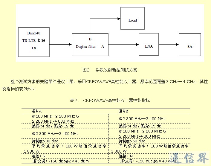 鉴于上述情况,为了解决频谱仪动态范围和灵敏度不足的问题,本文提出了一种新型的测试方案。本方案采用如图2所示的吸收法:即利用双工器将滤波器的载波信号通过负载吸收,解决测试过程中频谱仪动态范围不足的问题。同时LNA提高了杂散发射电平,使其位于频谱仪的底噪之上,解决测试过程中频谱仪灵敏度不足的问题。