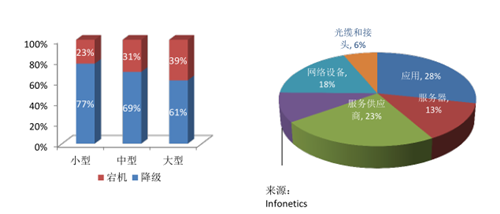 数据中心管理员最大的担心之一是系统宕机,系统宕机会带来巨大的损失(图一)。光缆、接头、网络设备以及应用和安全等问题都会引起系统的宕机(图二)。虽然网络布线和接头只占宕机总时间的6%,布线系统却能够影响网络设备,安全和服务器。因此合理地选择布线系统可以最小化降低网络宕机时间。