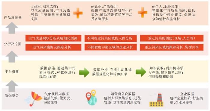 c) 分析及挖掘:通过用户画像、用户轨迹、业务偏好等与大气质量现状分析、大气质量精细化预测模型相结合,实现对个人群体的影响评估及预防、对敏感人群的污染趋势预测推送、对污染区域的疏散预警等。通过大气数据与企业数据的关联,辅助实现污染溯源分析、污染源的产能动态规划等。