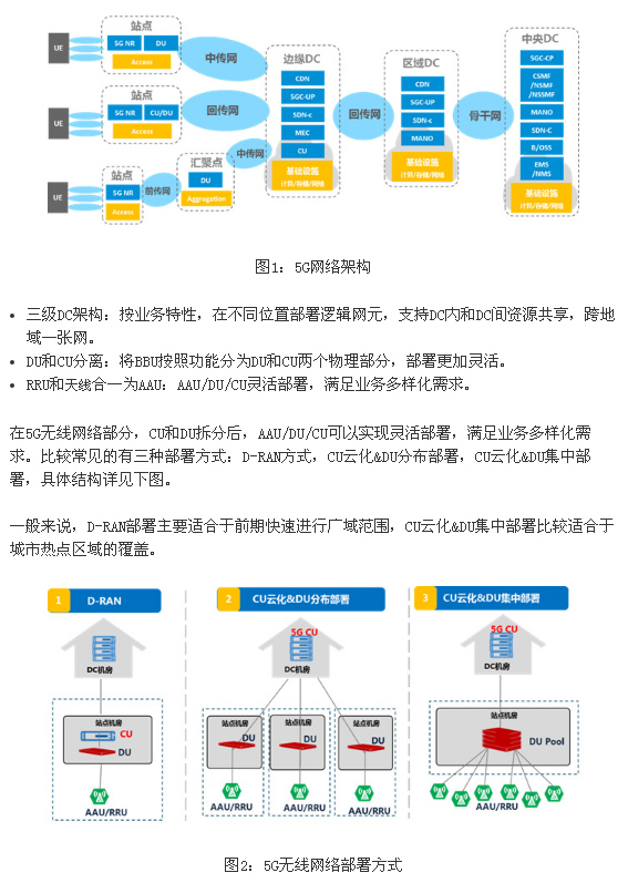 CU云化&DU集中部署是将CU放置在DC机房中,DU集中部署在同一个物理站址,通过光纤拉远至远端AAU组成基站,比较常用的有集中供电和分散供电。