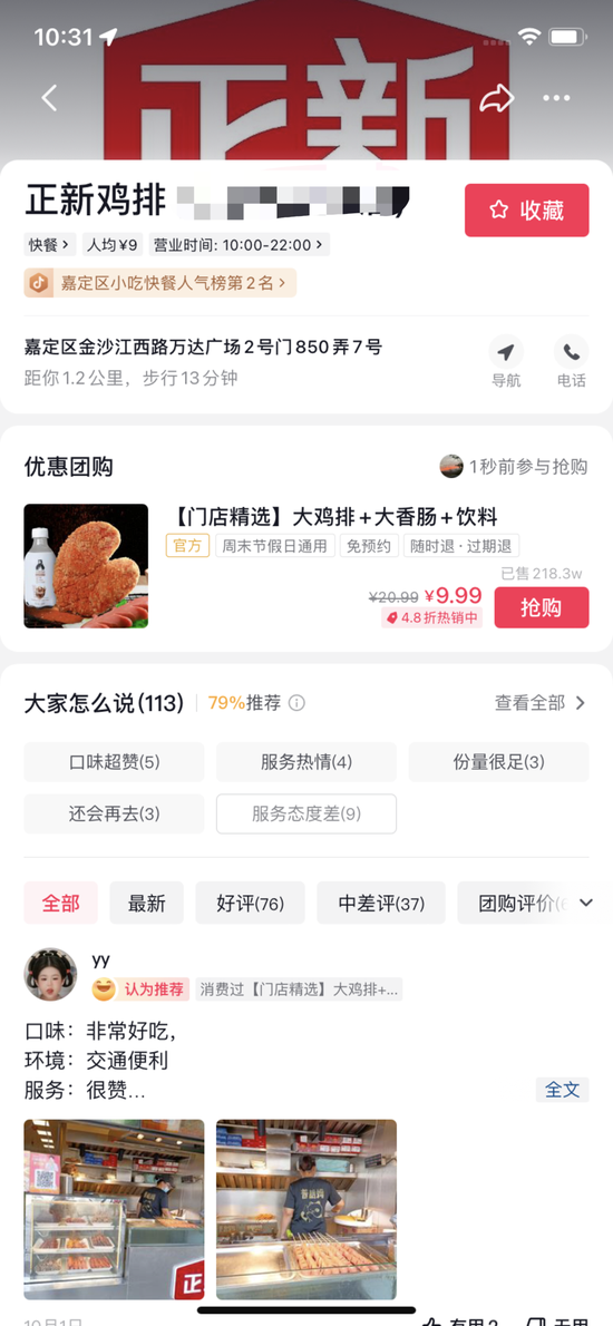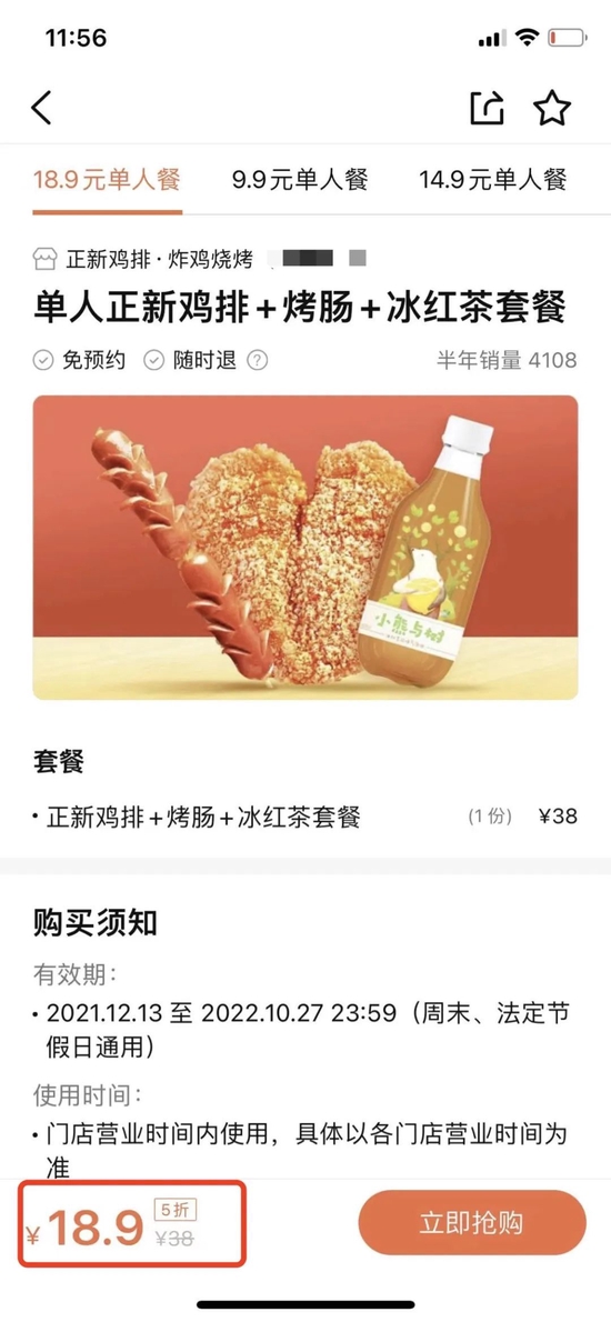 另一个品牌青睐抖音团购的例子来自连锁加盟模式,一家在抖音团购上嘉定区小吃类人气榜稳定前三的正新鸡排。店里9.9元的抖音团购套餐能买到鸡排、烤肠、酸梅汁三件套,而同样的套餐内容在美团上购买团购券还要18.9元。