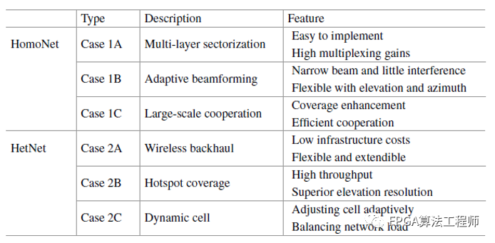 应用场景的定义是研究的一个重要步骤,可为关键技术的开发提供指导。如下表所示,所有这些不同网络部署下的场景大致可以分为两种类型,即Case 1 :只有宏站部署的同构网络(HomoNet)和Case2:具有宏站和小站的异构网络(HetNet)。