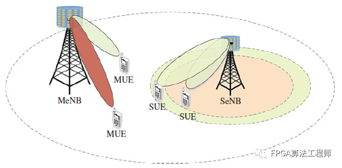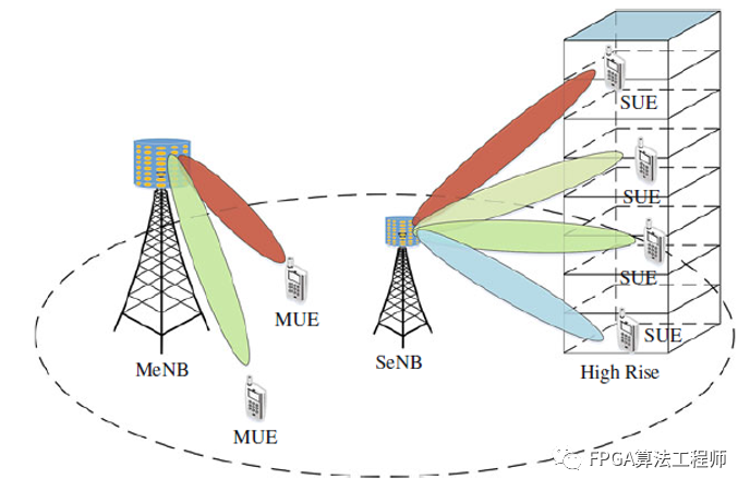 统计数据显示,大部分的远程通信来源于建筑物,如超市、办公楼、体育馆等。因此, 对于HetNet来说,高质量的建筑的室内覆盖被认为是最关键的场景之一。由于远程通信是在建筑物的不同高度产生的,传统的采用固定Downlink (DL)倾斜的AA,主要用于UE在街道层面漫游,不再适合这种场景。大型AA能够动态调整波束的方位角和俯仰角。它可以将光束直接传输到建筑物不同楼层的终端,从而显著提高系统吞吐量。然而,当建筑的室内覆盖由MeNB提供一个巨大的AA,可调节范围俯仰角比SeNB小,角度分辨率不能满足UE的需求,如图5所示。众所周知,SeNB和SUE之间的近距离可以减少路径损失。因此,配备大规模AA的SeNB更适合内置覆盖率,前提是部署成本是可接受的。