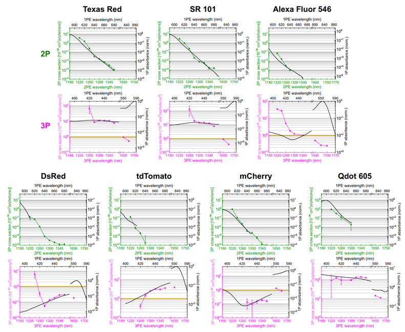 科研界普遍认为,绿色和红色荧光团的吸收峰相去甚远,但荧光团的三光子吸收谱与单光子吸收谱并不完全一致。三光子截面的峰值相对其单光子吸收峰会蓝移数百纳米,这为单一波长同时激发绿色和红色荧光团提供了基础。