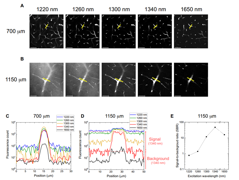 图3是不同激发波长对Texas Red标记小鼠大脑血管的多光子图像。如图所示,随着波长从1220 nm到1340 nm,三光子荧光信号的比例逐渐上升,图像的信噪比也逐渐上升。1650 nm激发的三光子荧光图像相较于1340 nm信噪比有略微的下降,原因是1650 nm的三光子截面要低于1340 nm。