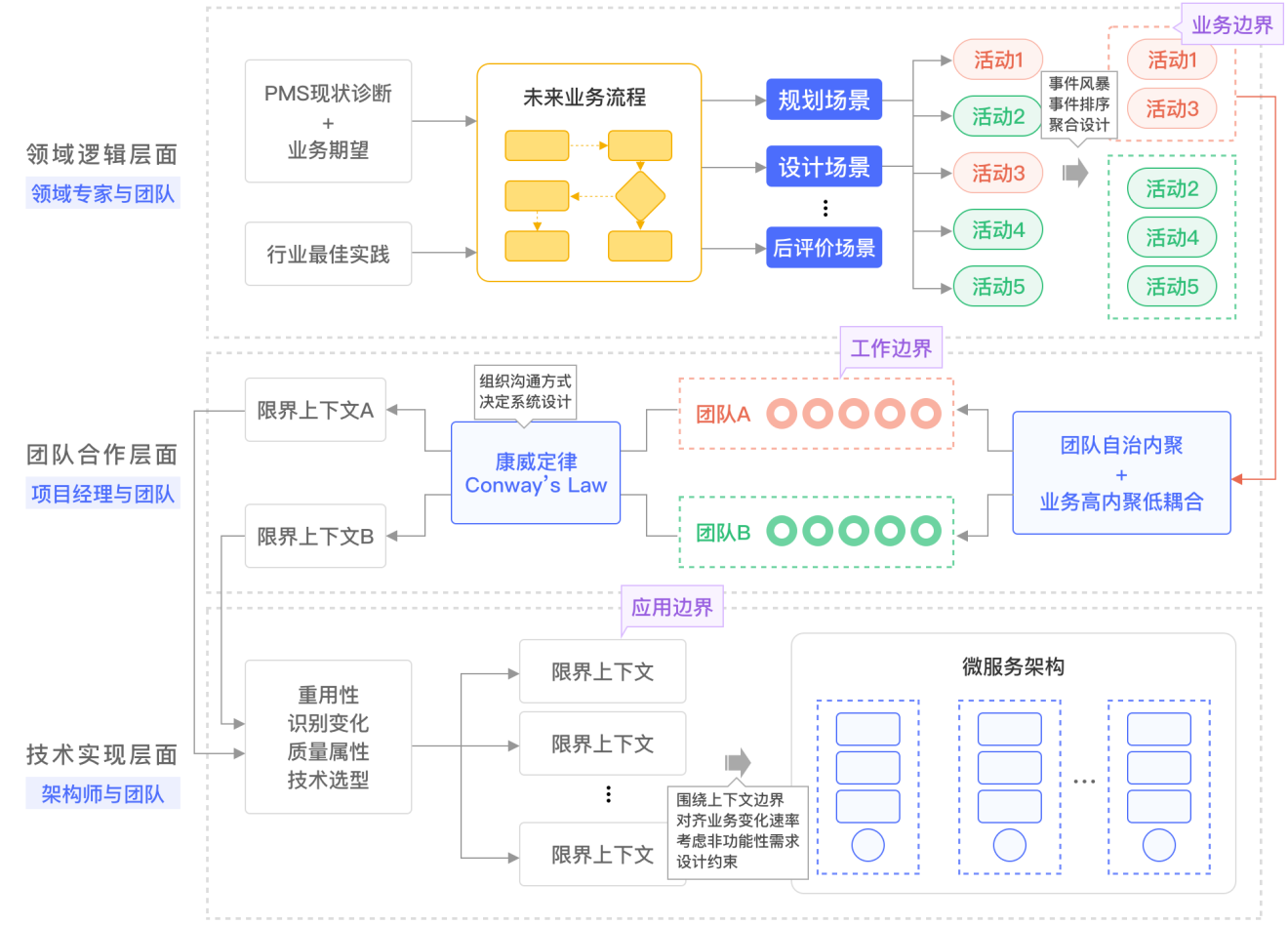 项目团队在领域专家的带领下通过对行业最佳实践的学习以及对PMS现状诊断及业务期望的分析,梳理系统全景业务流程并对流程进行业务边界的划分。基于业务边界,依据康威定律划分团队,各团队由领域专家和研发组成,每个团队在各自的业务领域进行分析与设计,团队间协作关系由项目经理进行协调。架构师在领域专家配合下,在技术实现层面进行微服务设计指导研发编码实现。