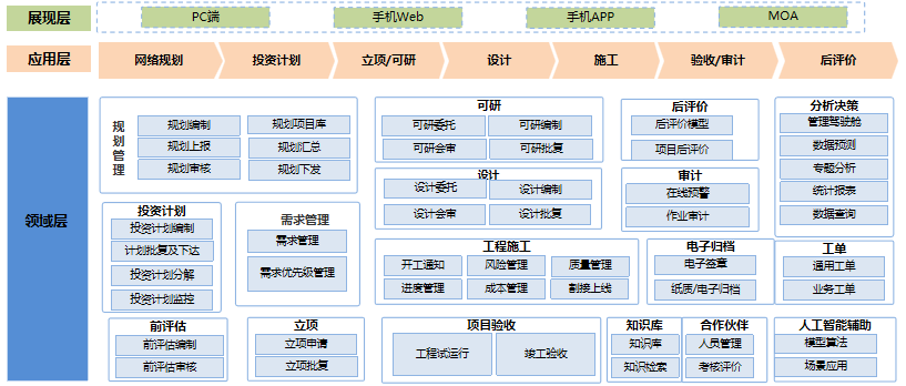基于上述背景,中国移动集团启动了集中化计划建设系统的研发工作。集中化计划建设管理系统是一个融管理, 业务, 架构于一体的管理系统,实现了计划建设领域全生命周期流程覆盖、全专业支撑,要求做到管理一体化、业务一体化以及架构一体化。