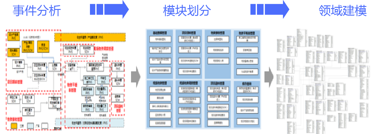 其中以物资微服务为例,通过分析划分出8个模块(基础数据、项目领料、物资接收、物料平衡、现场物资、现场物资调拨、项目退料和库存查询),然后分别对每个模块进行建模,指导研发工程师建立ER关系图。