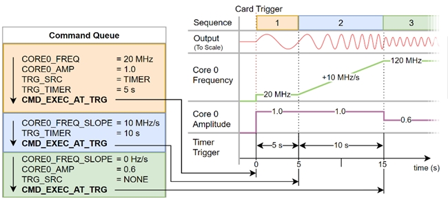 DDS 模式示例:只需几条指令即可生成正弦波(橙色)、加速频率(蓝色)以及降低振幅(绿色)