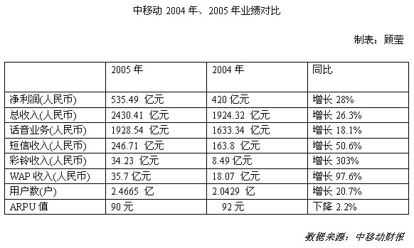 根据中移动公布的财报,2005年全年,中移动的总收入是2430.41 亿元人民币,同比增长26.3%;纯利润535.49 亿元,比上年增长28%。此前的2004年,中移动全年纯利润为420亿元,同比增长18.13%,营业收入为1923.81 亿元,经营利润628.85 亿元。