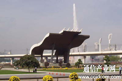 会展中心大门外的雕塑和数十米高的喷泉
