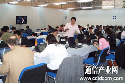 新闻中心里众多记者正在忙碌的工作