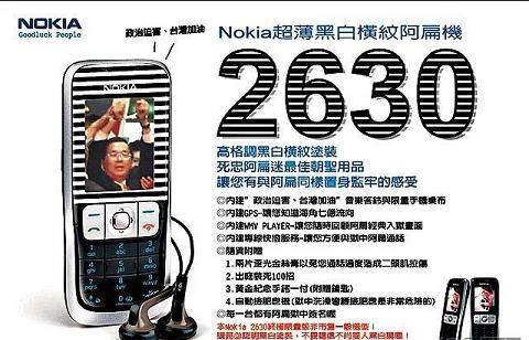 台湾网友Vincent的广告词让人捧腹,“Nokia2630阿扁限量机”外装设计是以高格调的黑白横纹涂装,如果要对扁家洗钱疑云深入了解,可用手机内置的“GPS”功能得知“海角七亿”的流向,而内建铃声当然是“政治迫害台湾加油”,更妙的是里面还附上“出庭装死一百招”。