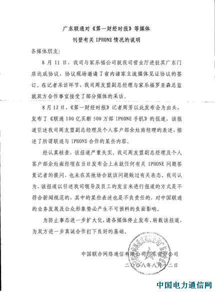 日前,中国联通广东省分公司向各大媒体发布声明《广东联通对<第一财经时报>等媒体刊登有关IPHONE情况的说明》。