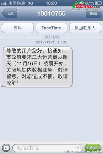 11月16日下午消息,三大电信运营商短信通知关闭深圳地铁Wi-Fi有进展,今天上午11时,深圳地铁才在官方微博回应,称关闭1天3G数据业务信号开展相关测试。