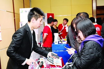 近日,辽宁移动大连分公司召开首届终端产品订购洽谈会,以“携手中国移动,终端成就未来”为主题,在供货平台、渠道经销商与终端厂商之间搭建了较好的沟通平台,当日共订购终端73304部,其中44家代理商订购了56904部、自有营业厅订购了16400部,实现了多方共赢。图为联想厂家促销员正在为代理商介绍产品卖点。