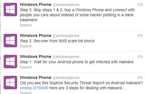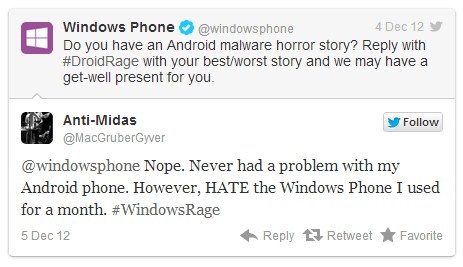 昨天我们曾报道微软今年又开始在Twitter上开始了#DroidRage的活动,目的就是让Android用户在其微博中痛诉惨痛的恶意程序困扰经 历,并有望获得一款WP手机,不过很显然这种重复的以攻击他人的举动遭到了消费者的普遍厌恶情绪。根据活动的相关内容,针对Android系统木马恶意程 序猖獗的情况WP团队也给出了使用Android系统的三个后果: