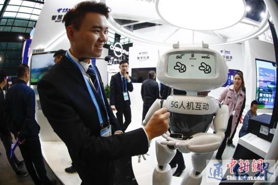 11月7日,在浙江乌镇举行的第五届世界互联网大会“互联网之光”博览会会场内,一台5G人机互动机器人与工作人员玩起了“猜拳”的游戏,迅速的反应让参观者吃惊。中新社记者 杜洋 摄