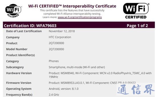 今天,来自Wi-Fi联盟的消息显示,该手机将通过Wi-Fi认证,适用于2.4 GHz b / g / n频段,并将预装Android8.1 Oreo。