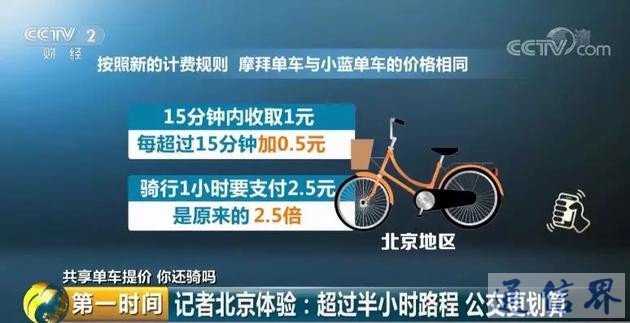 在北京地区,按照新的计费规则,摩拜单车与小蓝单车的价格相同,15分钟内收取1元,每超过15分钟加0.5元,也就是说骑行1小时要支付2.5元。