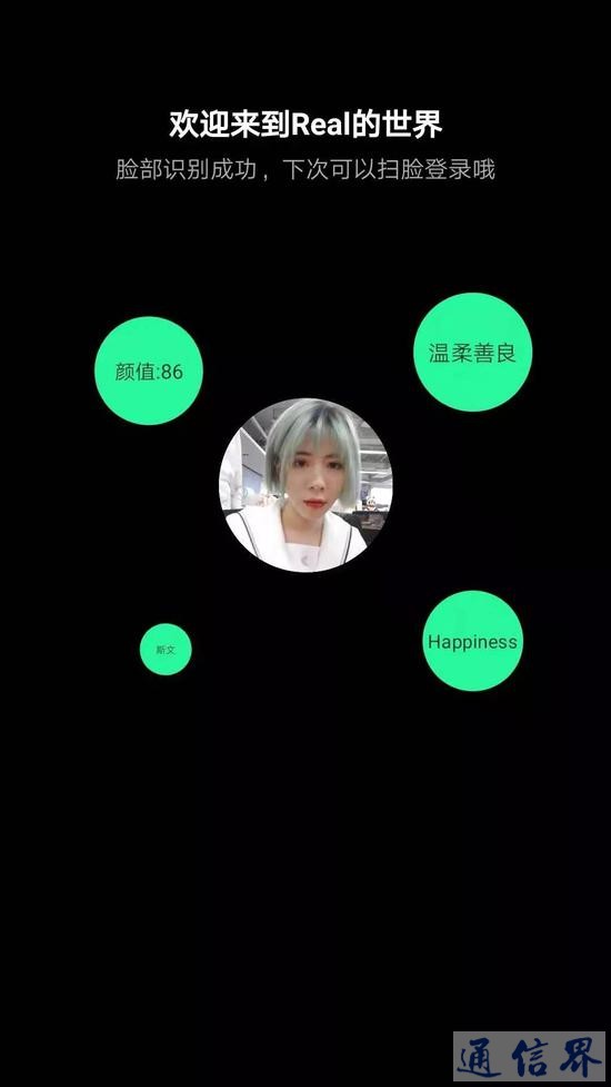 一开始就是脸部识别登陆,也是这款APP的重要特色。脸部识别成功后,会显示“欢迎来到Real的世界”,系统会通过脸部识别后给出标签。看脸识别用户的性格、颜值几何,让人不由觉得这款APP有些神奇。