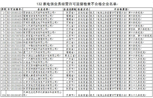 附:132家电信业务经营许可相关监督检查不合格企业名单