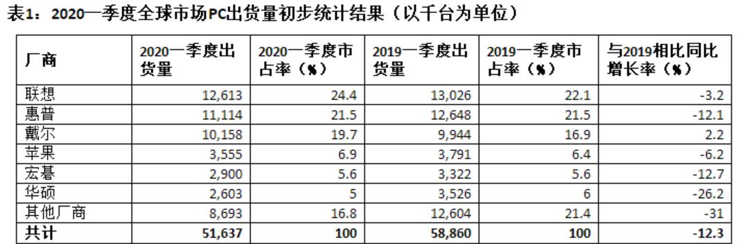 表1:2020一季度全球市场PC出货量初步统计结果(以千台为单位)