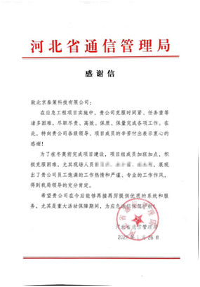 在河北省通信管理局致东方通的感谢信中,泰策科技的相关系统产品与服务品质、技术能力以及团队工作精神被予以高度认可。