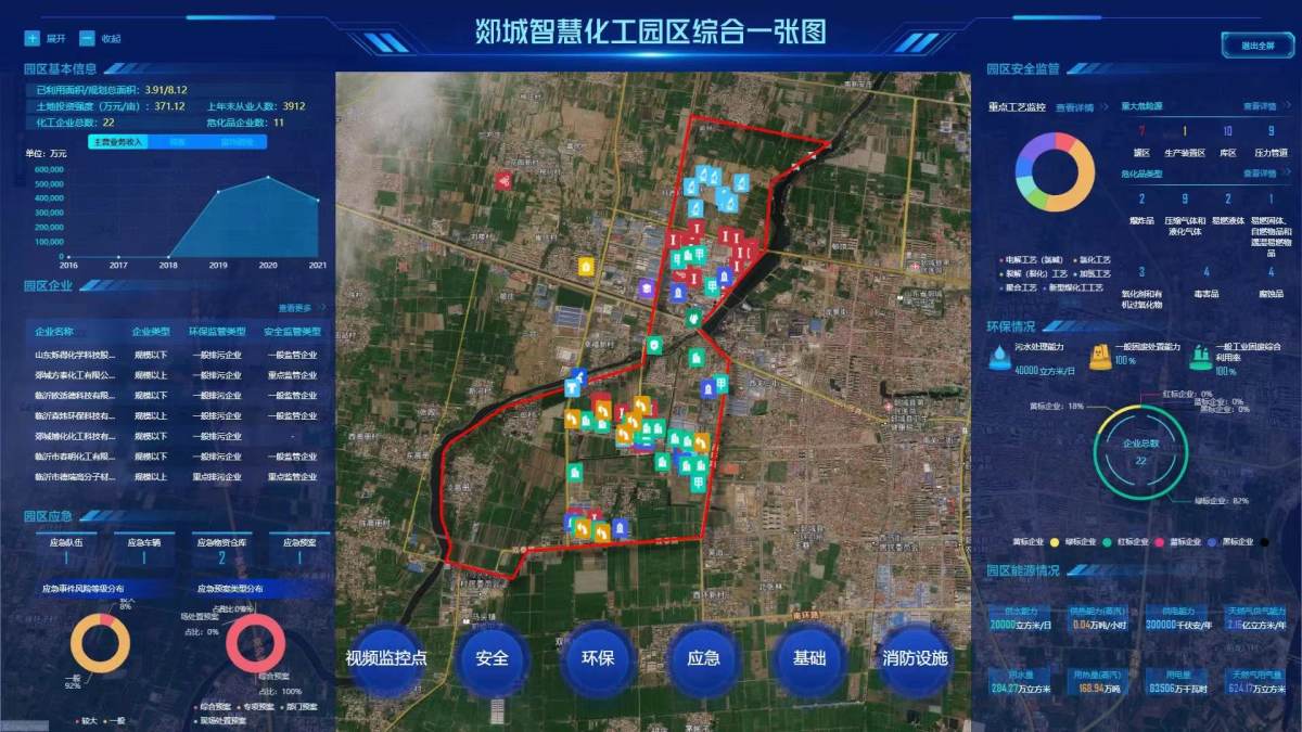 在智慧管理方面,山东省智慧化工综合管理平台基于地理信息系统,建设了综合管理、产业分析、质效评价等10个“一张图”,既可以掌握全省的整体情况,也可以查看地市、园区和企业的具体情况。