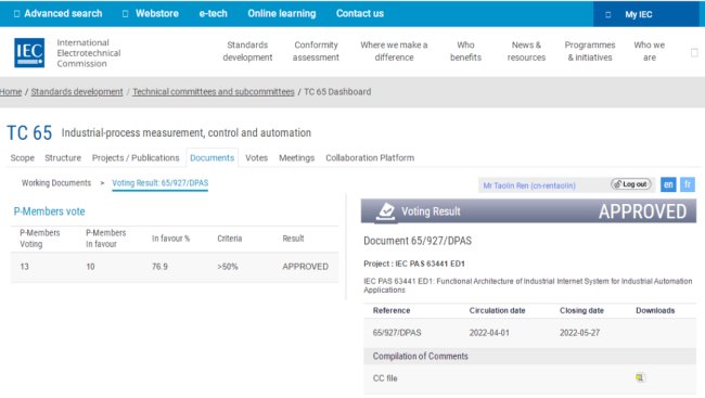 5月28日,IEC官网公布,由卡奥斯COSMOPlat联合机械工业仪器仪表综合技术经济研究所牵头制定的全球首个工业互联网系统功能架构国际标准IEC PAS 63441《Functional Architecture of Industrial Internet System for Industral Automation Applications》通过IEC/TC65(工业测控和自动化)投票,预计在2022年年底正式发布。