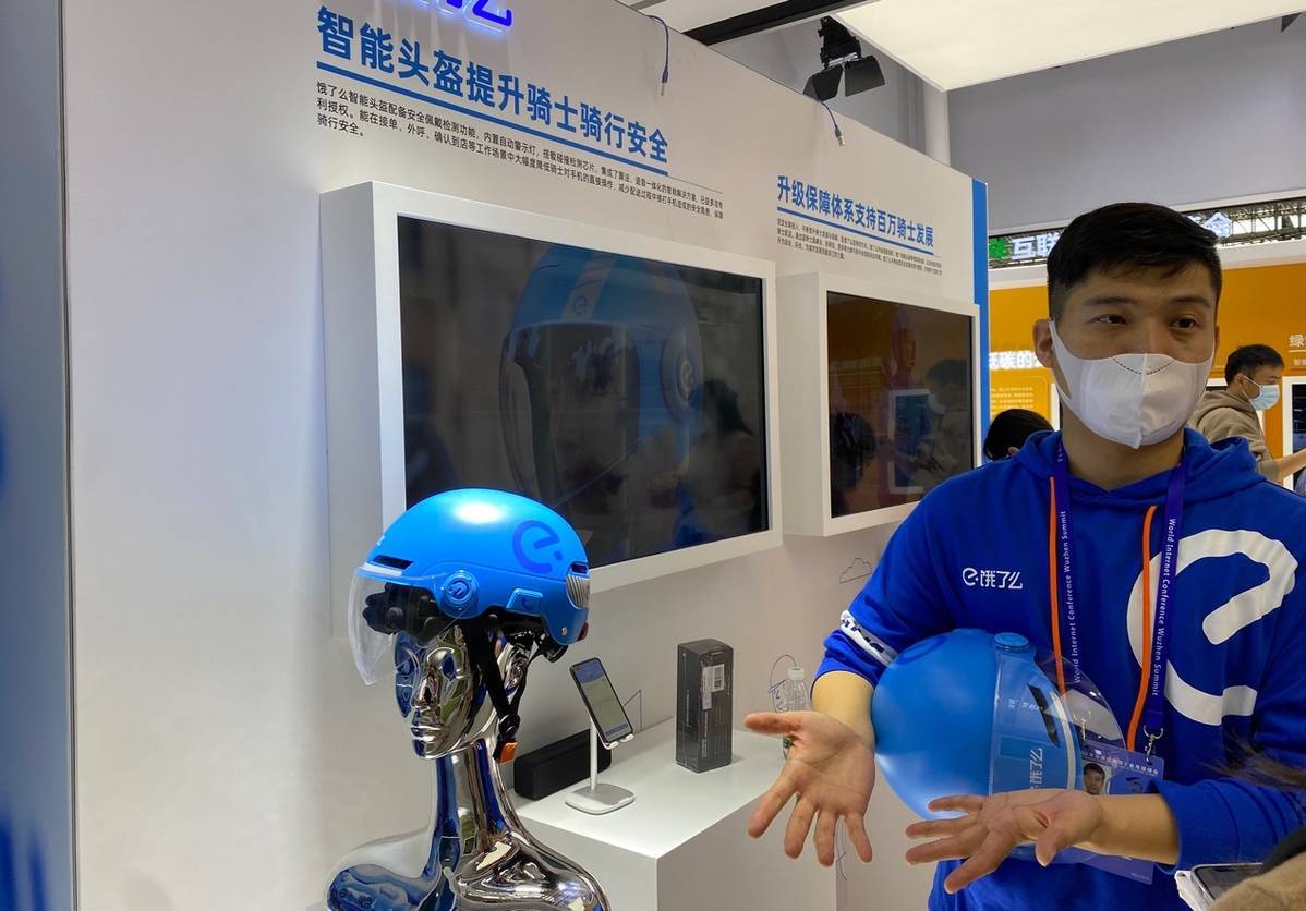 外卖骑手的安全问题一直备受关注。在博览会上,记者看到一款集合了手机和头盔功能的智能头盔。它利用物联网、大数据、人工智能等技术,在设计中加入传感器和硬件模组,一方面可以帮助识别骑手的安全状态,另一方面通过增加语音操作,减少对手机的直接操作,保障了骑手人身安全。
