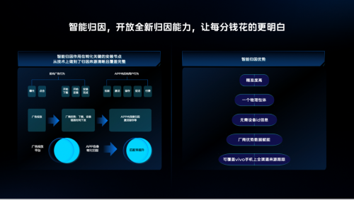 其中一个新的亮点是智能归因能力升级。智能归因作为不依赖于设备ID的系统级服务,在把握APP不同生命周期的基础上结合用户生命周期特点,以vivo全域效果优化视角为客户提供生态全域增长服务,呈现更全面的用户行为链路,共创更多营销可能性。