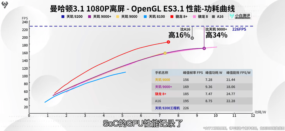 GPU方面,在GFXBench的曼哈顿3.1 OpenGL 1080P和Aztec Ruins Vulkan 1440P两项离屏测试中,天玑9200均展现出了傲人的成绩。其中曼哈顿3.1测试中,天玑9200的11核G715跑出了226fps的高分,性能相较于天玑9000+的169fps提升了34%,且是全场最高,刷新了小白测评数据库手机SoC的GPU性能记录。