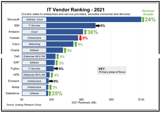 成立于1999年的Salesforce最开始专注于CRM(客户关系管理),后逐渐覆盖财税、人力等多个SaaS细分赛道,一直通过收购等方式扩充版图。根据市场研究机构Synergy Research Group报告,2021年全球有13家企业技术服务商年营收超250亿美元,Salesforce位列全球第13名,增速25%远超多家同行。