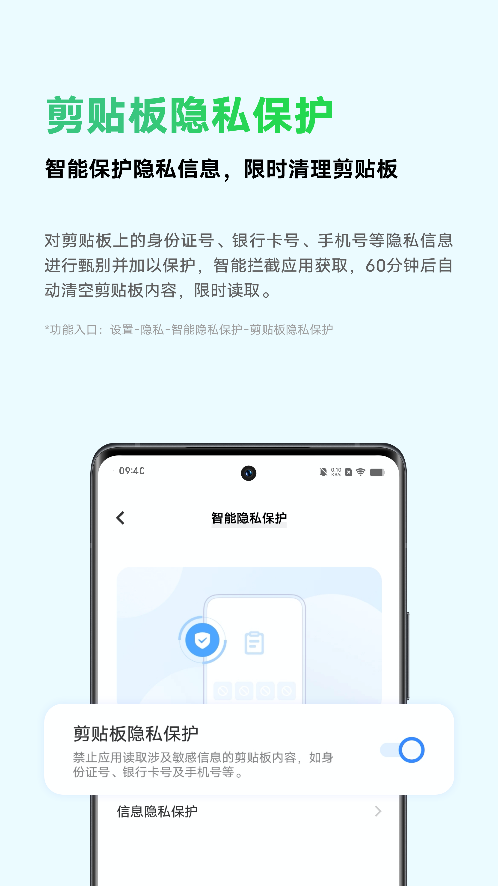 用户使用剪贴板复制粘贴内容时,一般用完即走。剪贴板还提供限时清空功能,以60分钟为单位,周期性对剪贴板上的内容进行清理。清空后,所有应用都将无法读取其内容。保证用户便捷体验的同时,进一步提升了安全性。