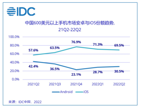 根据第三方调研机构IDC发布的市场监测报告,在中国600美元以上手机市场安卓与IOS份额趋势对比上,苹果在2021年第四季度达到了76.9%的最高点。尽管此后有所回落,但苹果在高端市场的地位坚如磐石。