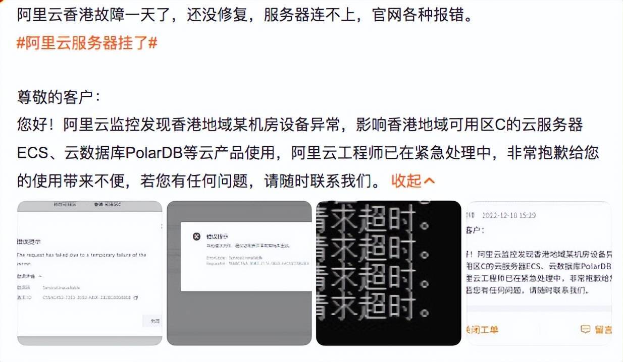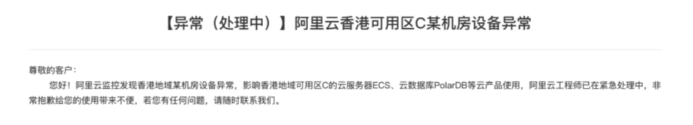 据悉阿里云是在10月18日上午10点47分发布公告,称“阿里云香港可用区C某机房设备异常。影响香港地域可用区C的云服务器ECS、云数据库PolarDB等云产品使用,阿里云工程师已在紧急处理中……”