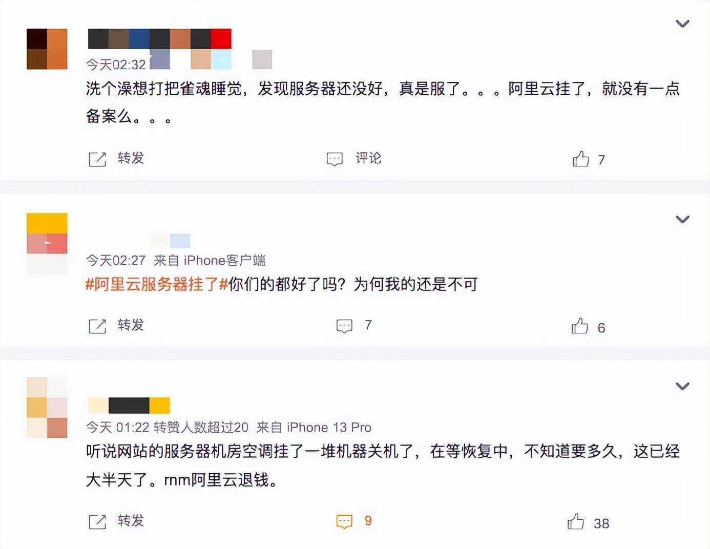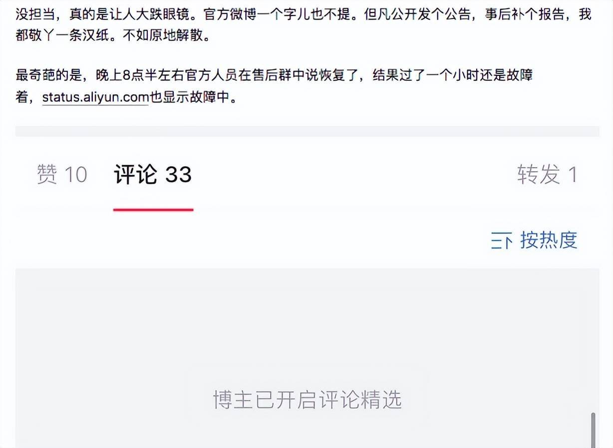 此外,也有网友表达了对阿里云的失望,称其“没担当”,因为阿里云的官微“一个字儿也不提”,该网友质疑称:“但凡公开发个公告,事后补个报告,我都敬他是一条汉字。不如原地解散。”