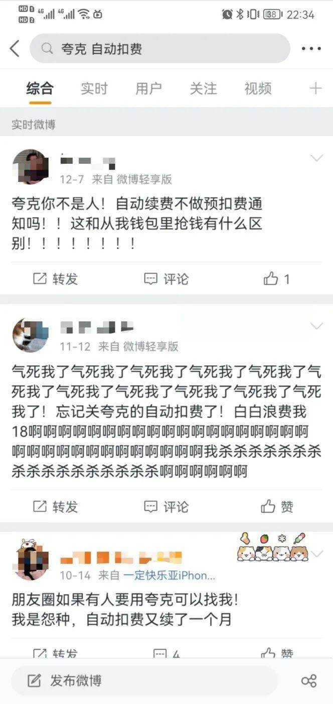 在各大社交媒体上,关于夸克会员自动扣费的吐槽高频率出现,甚至在微博上输入“夸克 自动扣费”关键词,排在前面的不乏谩骂,以及带有大量感叹号的情绪宣泄。