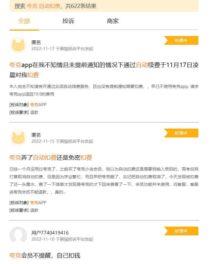在黑猫投诉上,从11月底开始,就密集出现关于夸克乱收费的投诉,包括但不限于,没开会员却出现自动续费的扣款、不发任何相关信息及提示的情况下连续6个月自动扣款、宣传三天免费会员却直接扣款包月25元……