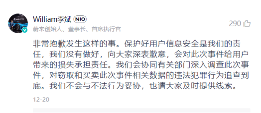为安抚车主情绪,蔚来创始人、董事长、首席执行官李斌还在公示下评论称,“非常抱歉发生这样的事。没有保护好用户信息安全是我们的责任,向大家深表歉意,会对此次事件给用户带来的损失承担责任。我们会协同有关部门深入调查此次事件,对窃取和买卖此次事件相关数据的违法犯罪行为追查到底。”