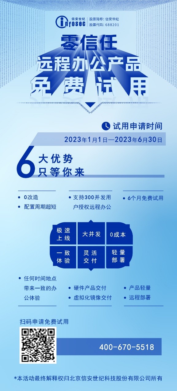大环境下,新冠疫情反复,企业纷纷开启了居家办公或混合办公模式,通过一部手机、一台电脑就实现疫情防控和工作进展两不误。信安世纪零信任远程办公产品完美适配远程办公场景,可以在大大提高企业应用系统安全性的同时,最大程度简化接入过程,提升业务效率。为回馈新老客户,信安世纪推出“零信任远程办公产品免费试用计划”,助力企业实现高效远程办公。