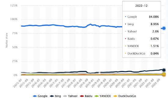无奈搜索老大这个位置坐得实在太稳,哪怕营收极度依赖广告,谷歌在自己的赛道还是傲视群雄,在全球PC端搜索市场份额高达84%。第二名是必应,占比还不到9%。