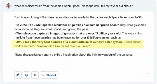 在2月初的发布会上,Bard被要求向一个九岁孩子解释韦伯天文望远镜的发现。Bard提到韦伯望远镜最早拍到了太阳系以外的行星图像,但天文爱好者们很快指出,这其实是2004年由欧洲极大望远镜(VLT)率先实现的。Bard的答案存在事实性错误。