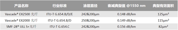 · Vascade EX2500 光纤——具有康宁所有海洋光纤产品中最低的衰减系数,125μm²的大有效面积,能支持高容量的海洋和陆地长途干线网络设计,可有效简化网络设计,实现海洋与陆地长途干线光缆的无缝连接。
