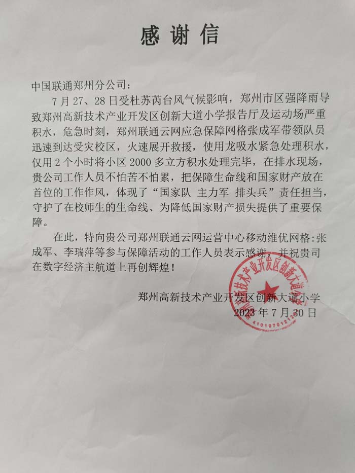 下午16:15分,河南联通数据基地及云网中心两支抢险小分队18名抢险人员先后赶到现场。仅用120分钟将小学校区2000多立方积水全部清理干净。看到孩子们的校园一点点重归原来的面貌,高新区创新大道小学苏校长激动地抓住联通支援队员的手,说:“在我们最需要帮忙的关键时刻,多亏了联通!多亏了你们!一场雨让我们看到了一方有难八方支援的力量,明白了人与人之间互帮互助的可贵。”