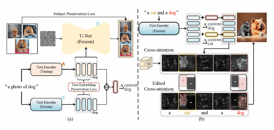 同样参考上面的例子,给定“一只狗坐在海滩上”作为输入,这两个文本编码器输出的文本编码,只在定制化概念对应的类别词(狗)这里差别较大,在其他词(海滩等。。。)的部分尽可能保持输出一致。结合原本的生成模型,微调后的文本编码器具有定制特定概念的能力,由于微调过程采用了文本编码保持损失的约束,这种能力可以通过计算微调过的文本编码器和原始文本编码器在类别词部分的平均差异,来得到需要的 residual token embedding: