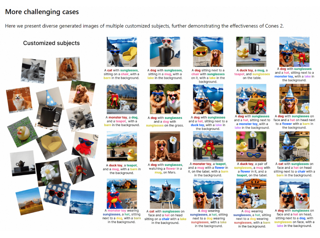 Cones 2 优势主要体现在 3 个方面。(1)使用简单而有效的方法来表示概念,可以任意组合,复用各种训练好单概念,从而进行多定制概念生成,而无需为多概念进行任何重新训练。(2)使用空间布局作为指导,这在实践中非常容易获得,用户只需要提供一个 bounding box,即可以控制每个概念的特定位置,并同时减轻概念之间的属性混淆。(3)在一些具有挑战性的场景下也能取得令人满意的性能:进行语义相似的多定制概念的生成,如定制两只狗,并且可以交换眼镜;在概念数量上,也可以合成六个概念。