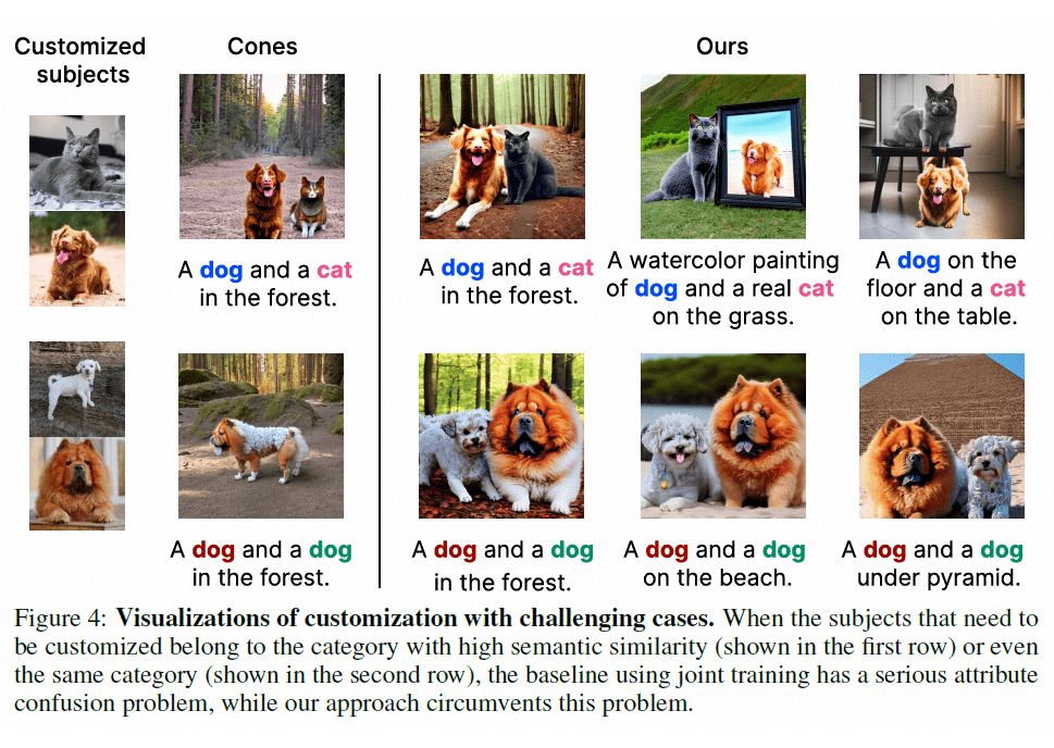 相比于单概念定制生成取得的成功,阿里提出的 Cones 和 Adobe 提出的 Custom Diffusion 作为现有的多定制概念生成方法仍存在两个挑战: