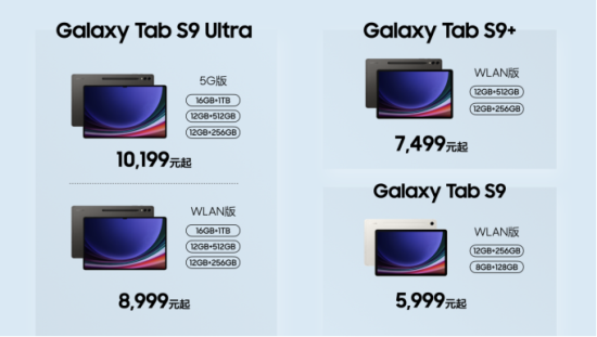 三星Galaxy Tab S9系列包括三星Galaxy Tab S9、三星Galaxy Tab S9+与三星Galaxy Tab S9 Ultra三款产品,均提供云雾金和云影灰两款配色供用户选择。其中,三星Galaxy Tab S9提供了8GB+128GB和12GB+256GB两种存储规格,建议零售价5,999元起;三星Galaxy Tab S9+提供了12GB+256GB和12GB+512GB两种存储规格,建议零售价7,499元起;三星Galaxy Tab S9 Ultra提供了12GB+256GB、12GB+512GB和16GB+1TB三种存储规格,建议零售价8, 999元起;三星Galaxy Tab S9 Ultra 5G提供了12GB+256GB、12GB+512GB和16GB+1TB三种存储规格,建议零售价10,199元起。